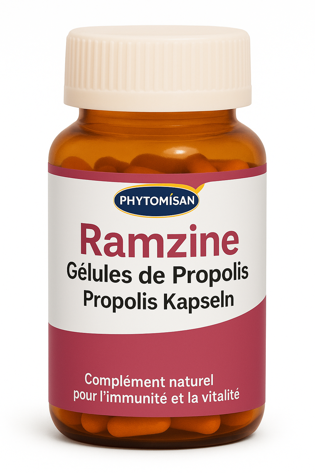 Entdecken Sie Ramzine, das natürliche Nahrungsergänzungsmittel auf Basis von reinem Propolis, das für seine schützenden, beruhigenden und revitalisierenden Eigenschaften bekannt ist.